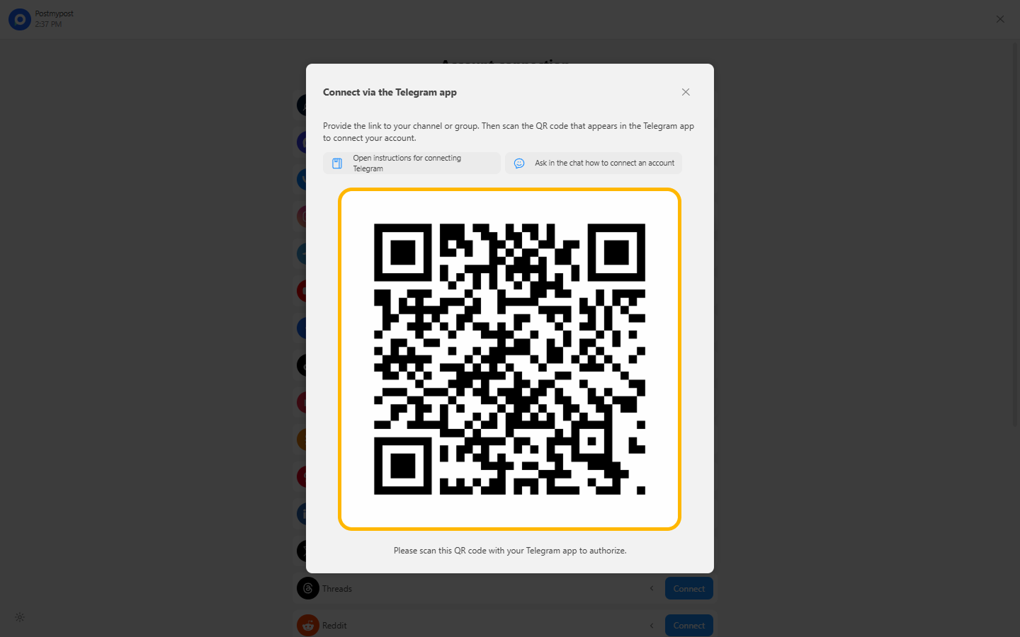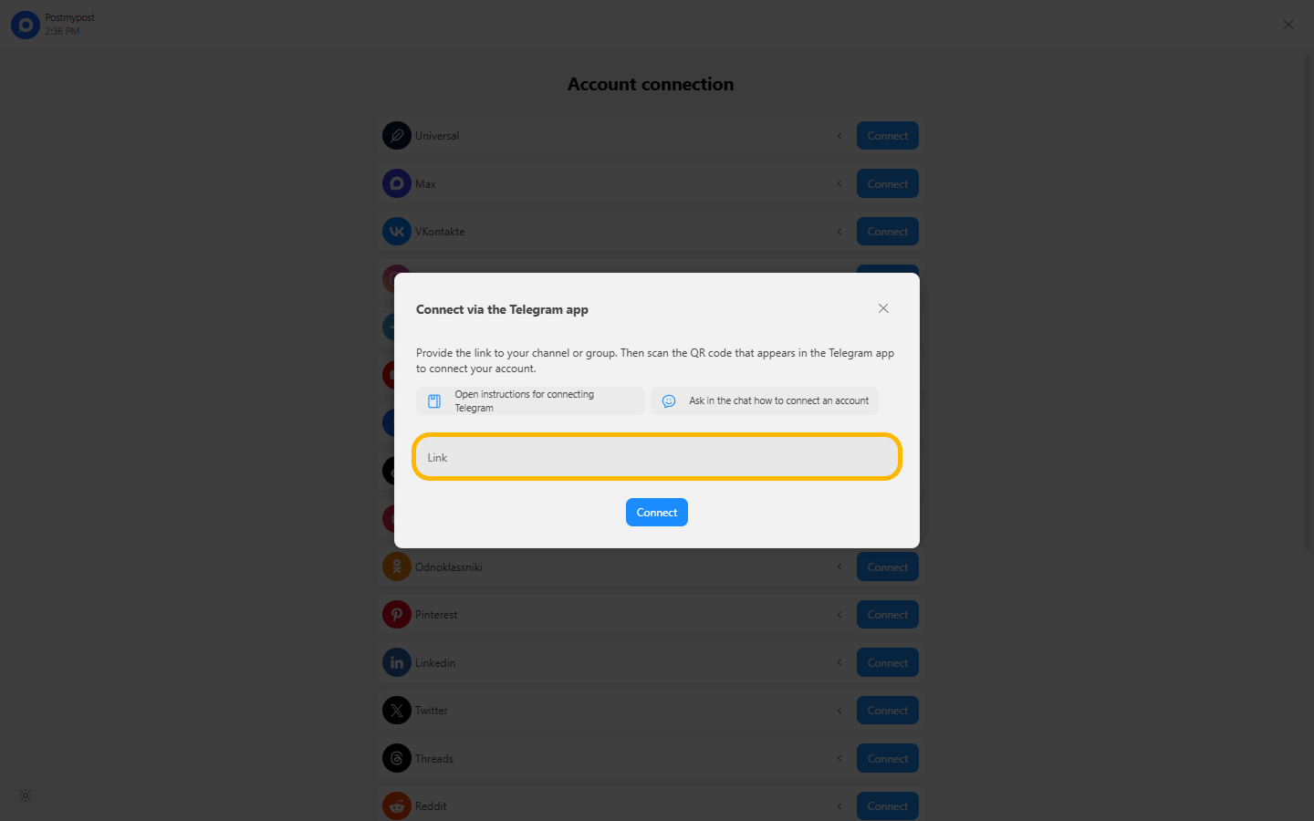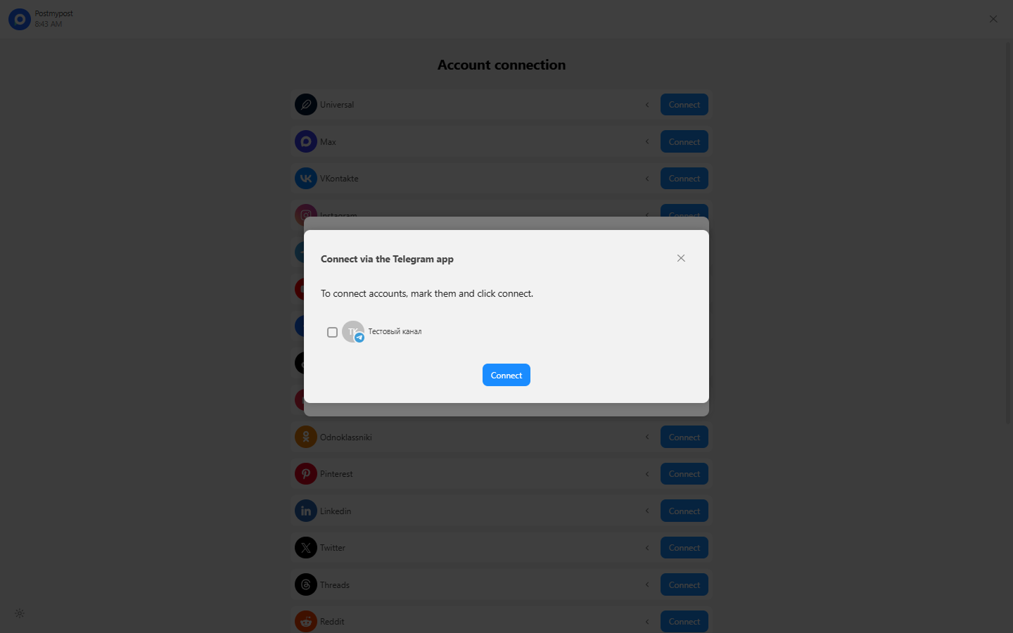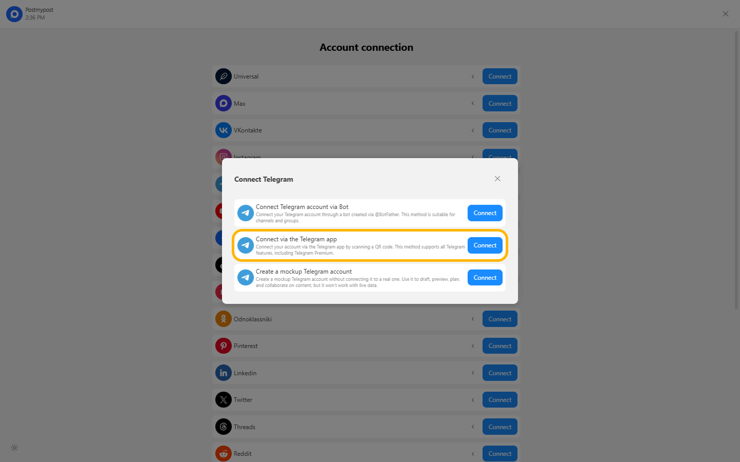 https://t.me/channelname. - In Postmypost, go to the Accounts section and click Connect. In the list of social networks, select Telegram and the connection type "Connect via Telegram app."
