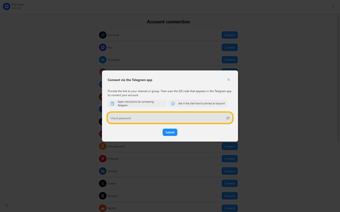 - Cloud password. If the "Cloud password" is enabled in your Telegram (Settings → Privacy), enter it in Postmypost. If the cloud password is not enabled, this step is skipped — you will immediately proceed to step 7, and the account will be connected.