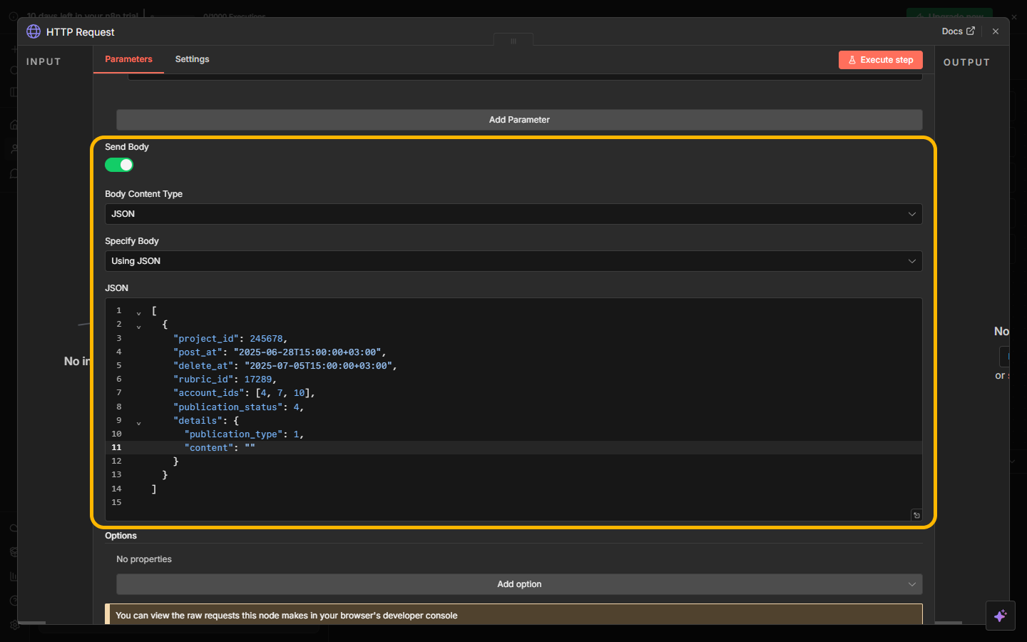 - Fill the request body with the required publishing parameters. A detailed description of all parameters is available in the API documentation. You must specify the project ID, scheduled publishing time, list of account IDs, status, and other publishing parameters.