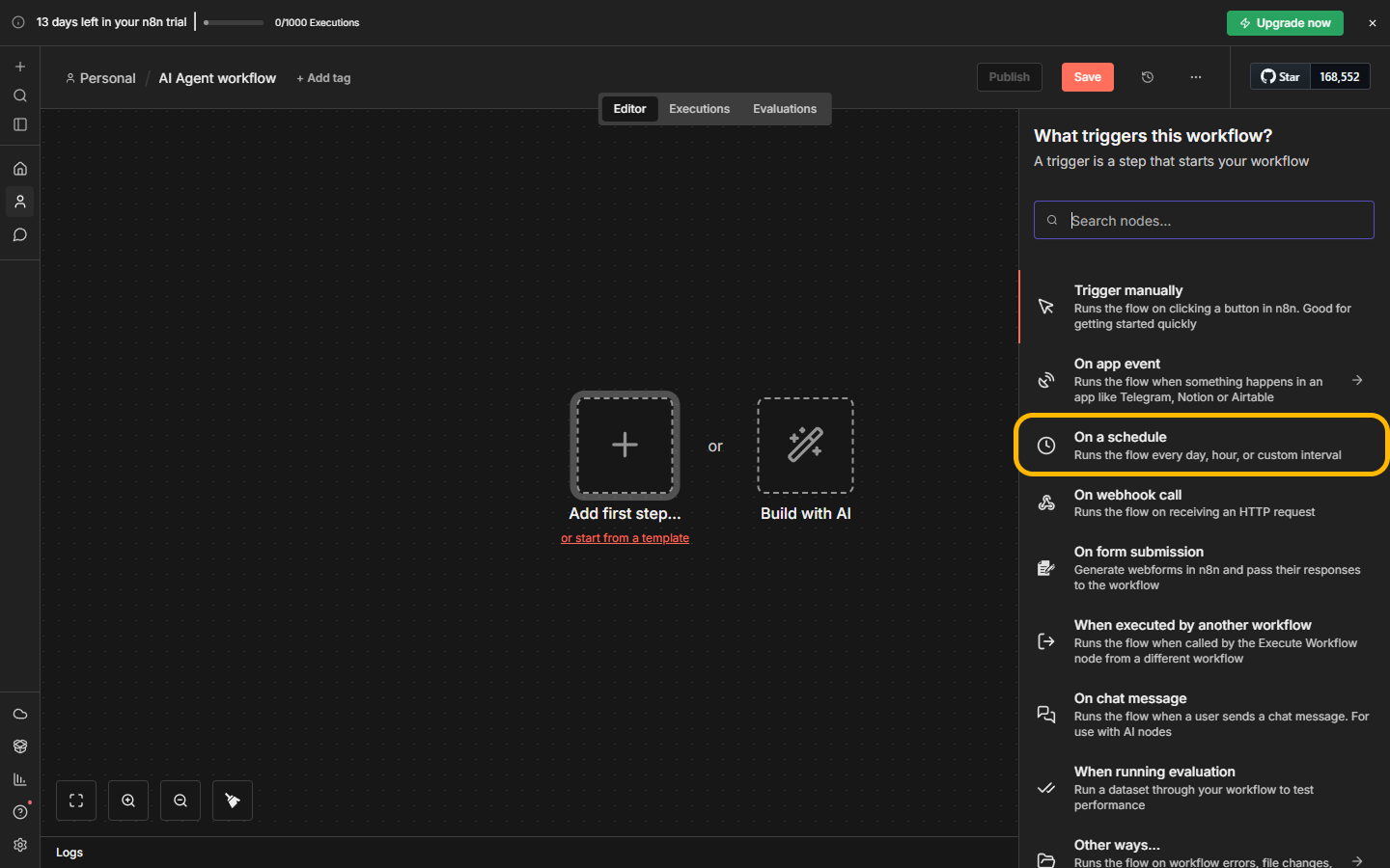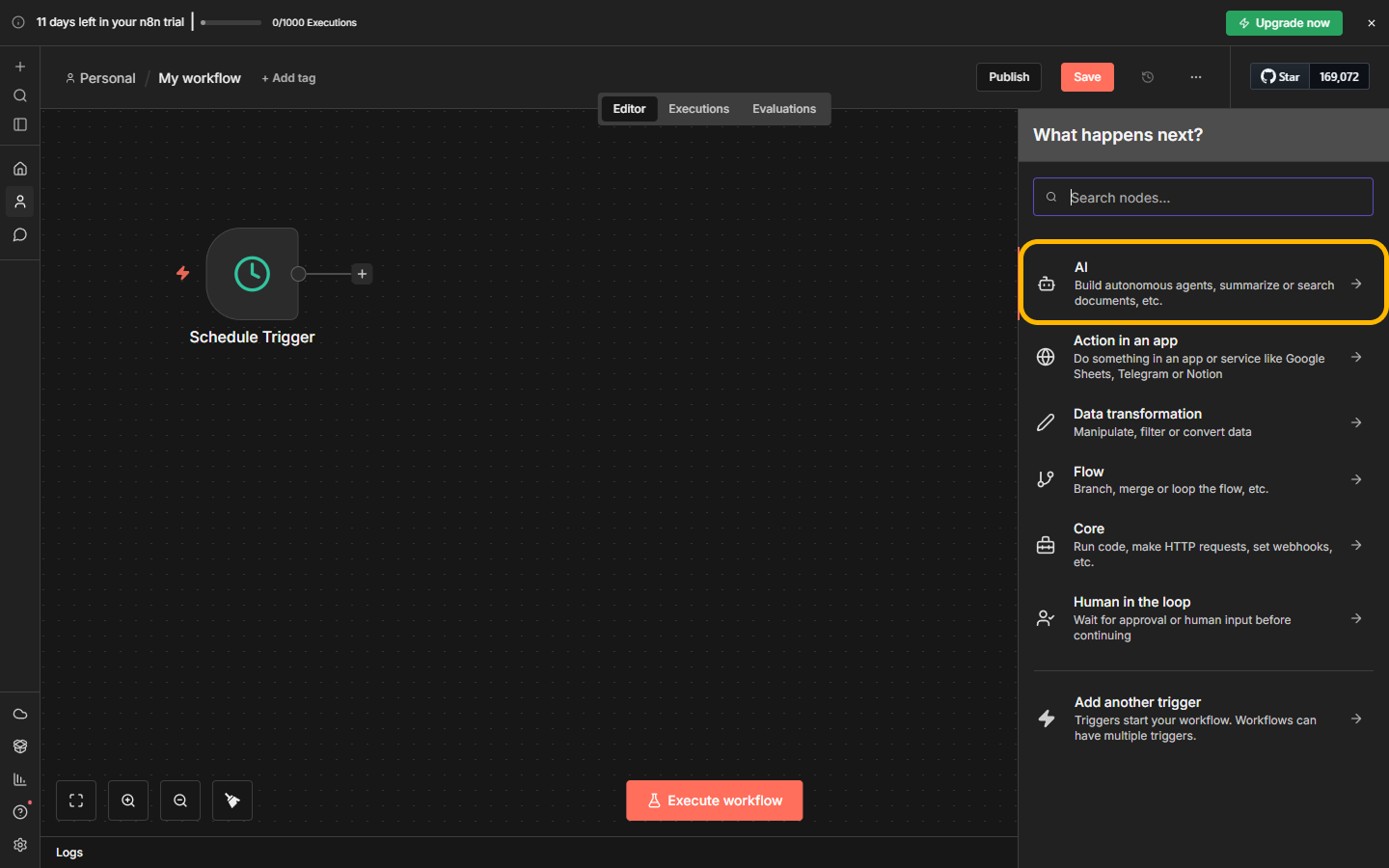 A scenario can be triggered manually, on a schedule, or by an event—for example, upon receiving a new message, creating a post, or receiving a webhook. Once launched, n8n sequentially executes all steps and transfers data from one node to another.