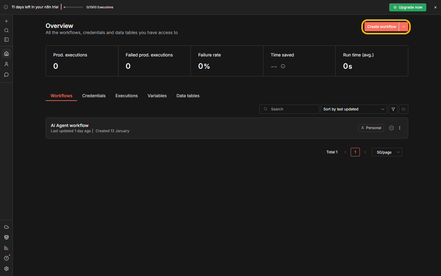 A workflow can be started manually, on a schedule, or by an event — for example, on a new message, record creation, or an incoming webhook. After start, n8n executes all steps in sequence and passes data from one node to the next.