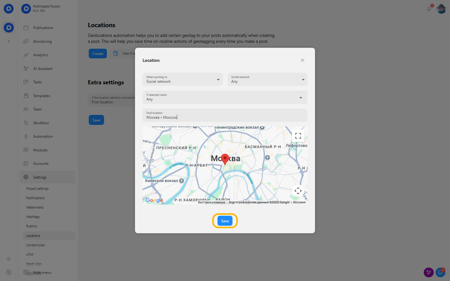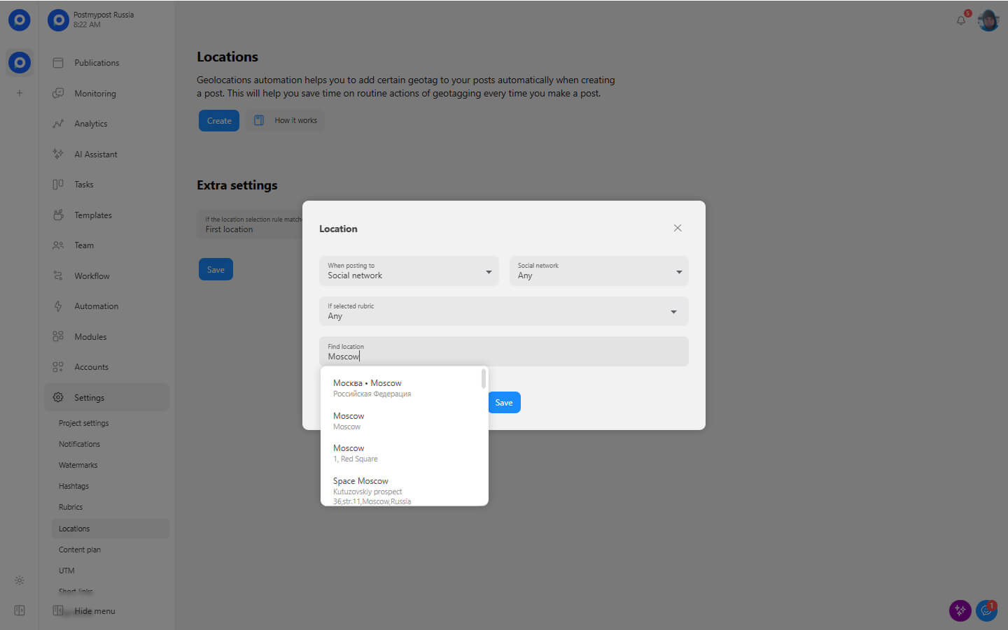 Automating geolocation in Postmypost allows you to automatically add a location to posts, eliminating the need to specify it manually each time. You can set up geolocation substitution rules for each social network or account.
