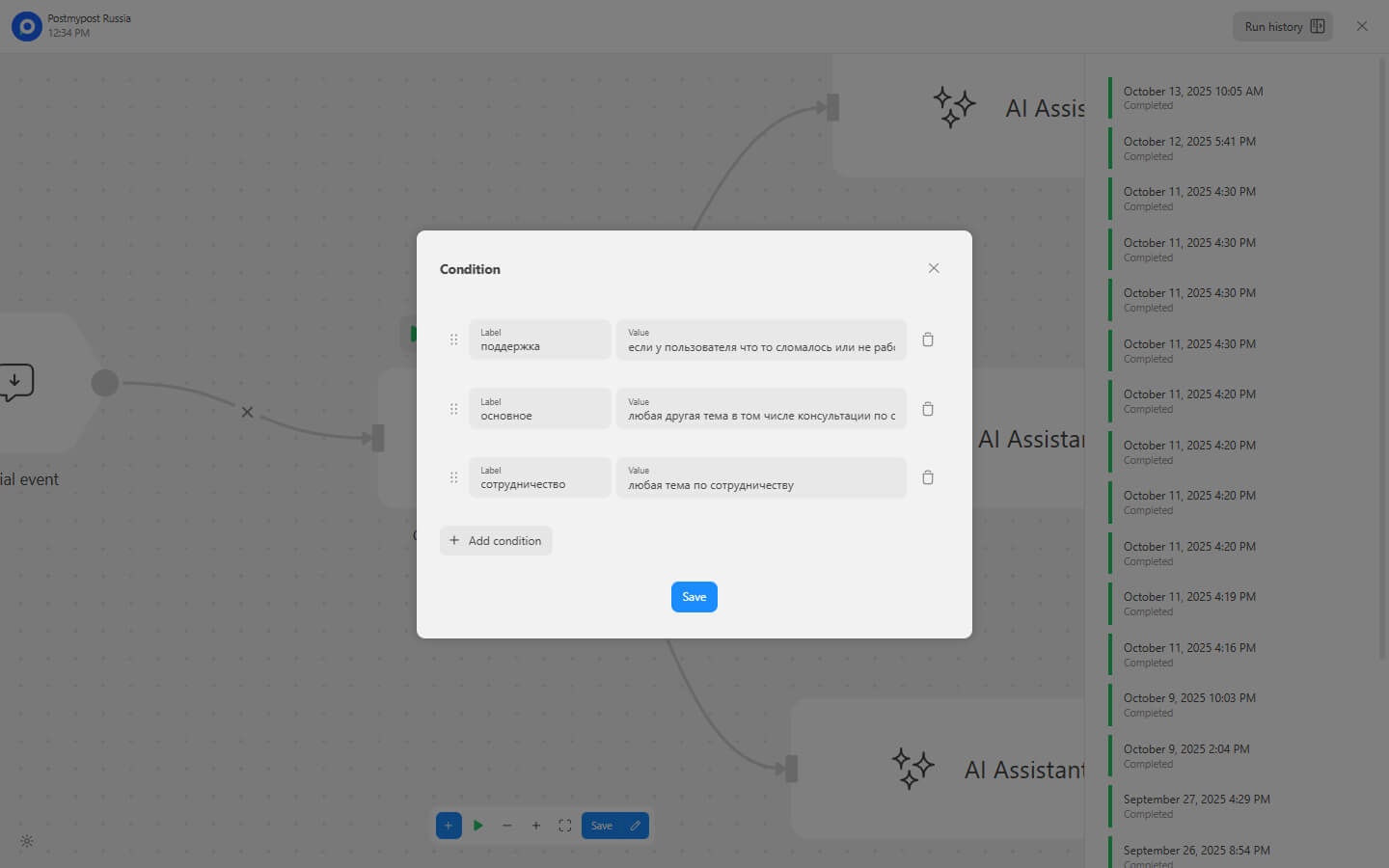 - Add an AI assistant block. Here you need to clearly explain how the assistant should behave. For example: "You are a marketing assistant. Respond concisely, friendly, and to the point. Avoid arguments, do not make promises on behalf of the company, do not discuss confidential topics. Always maintain a respectful tone."