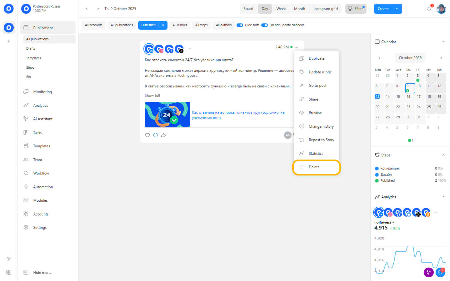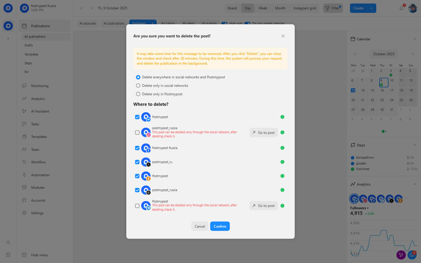 - Delete from both the service and social networks (the post will be deleted everywhere)
