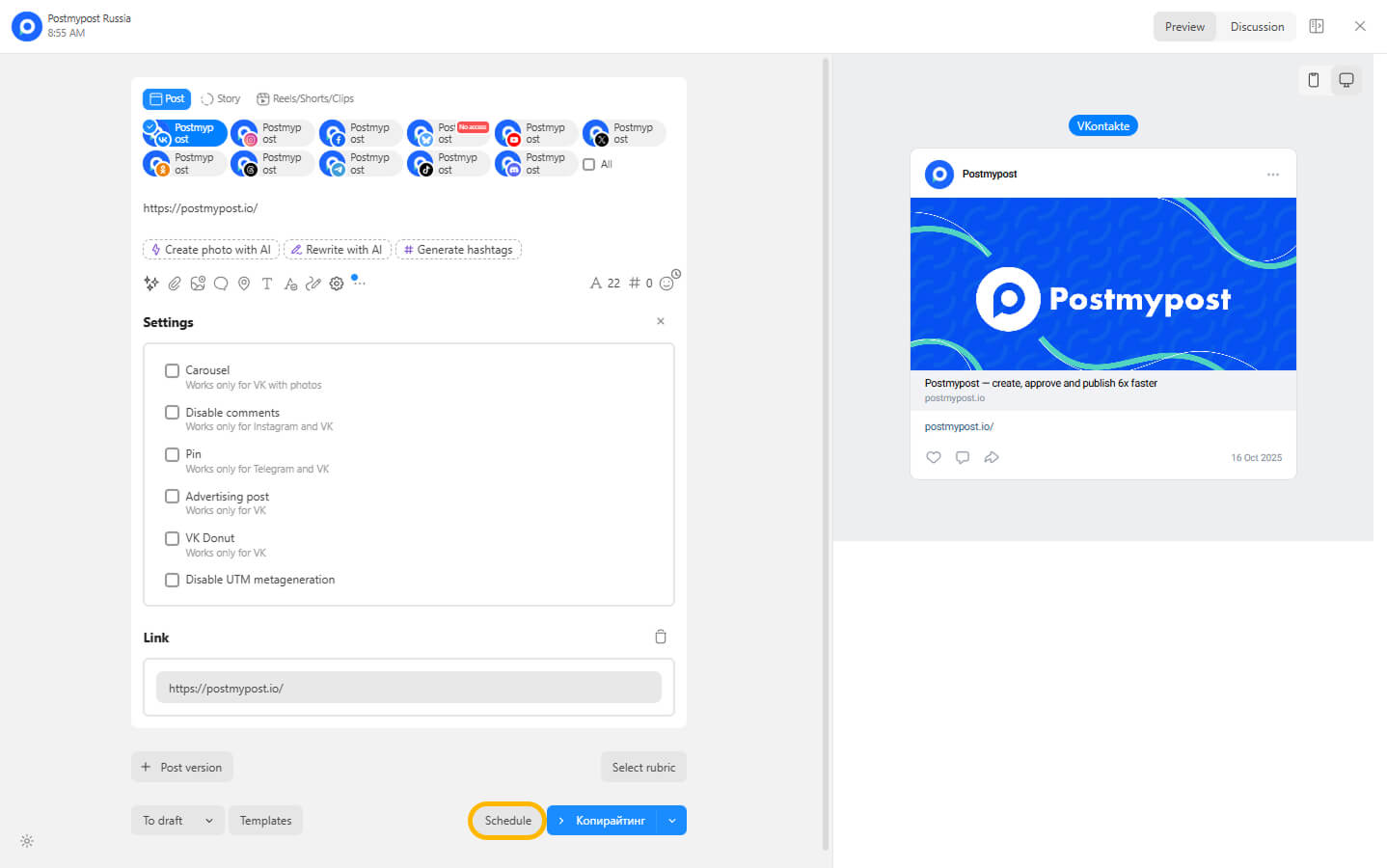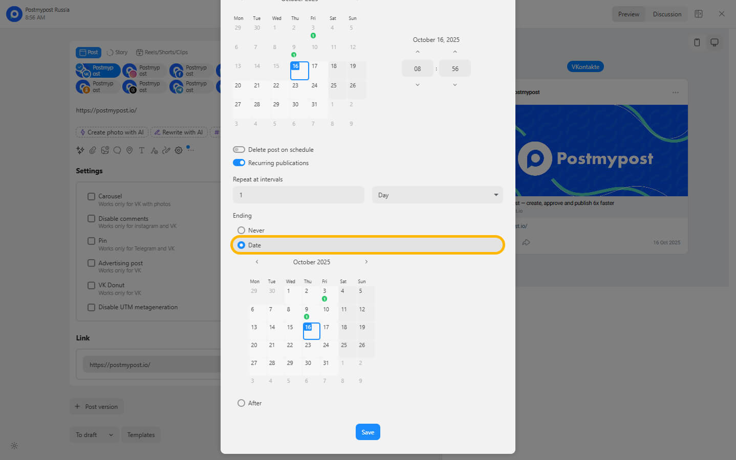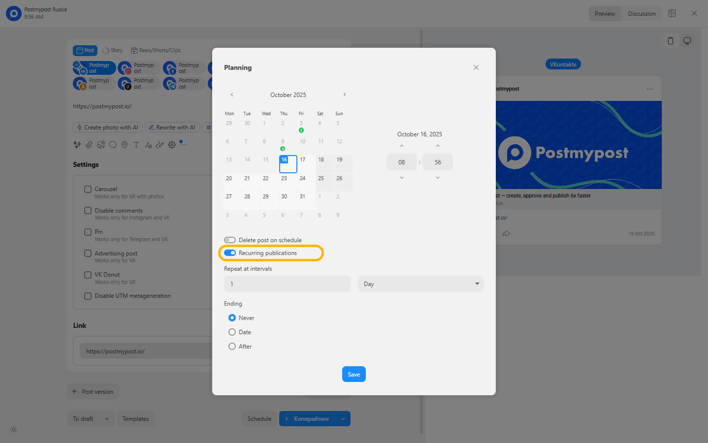 Recurring posts allow you to automate regular content posting on a set schedule without having to create each post individually.