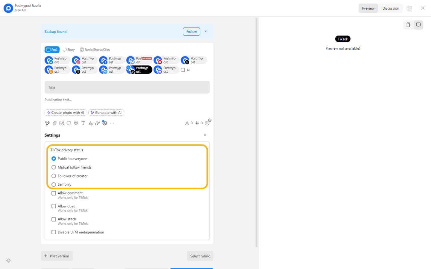 - Privacy status not selected — When creating a post, you did not specify who can see your post (e.g., "Public to everyone," "Mutual friends/subscribers," "Only for yourself," or other options).