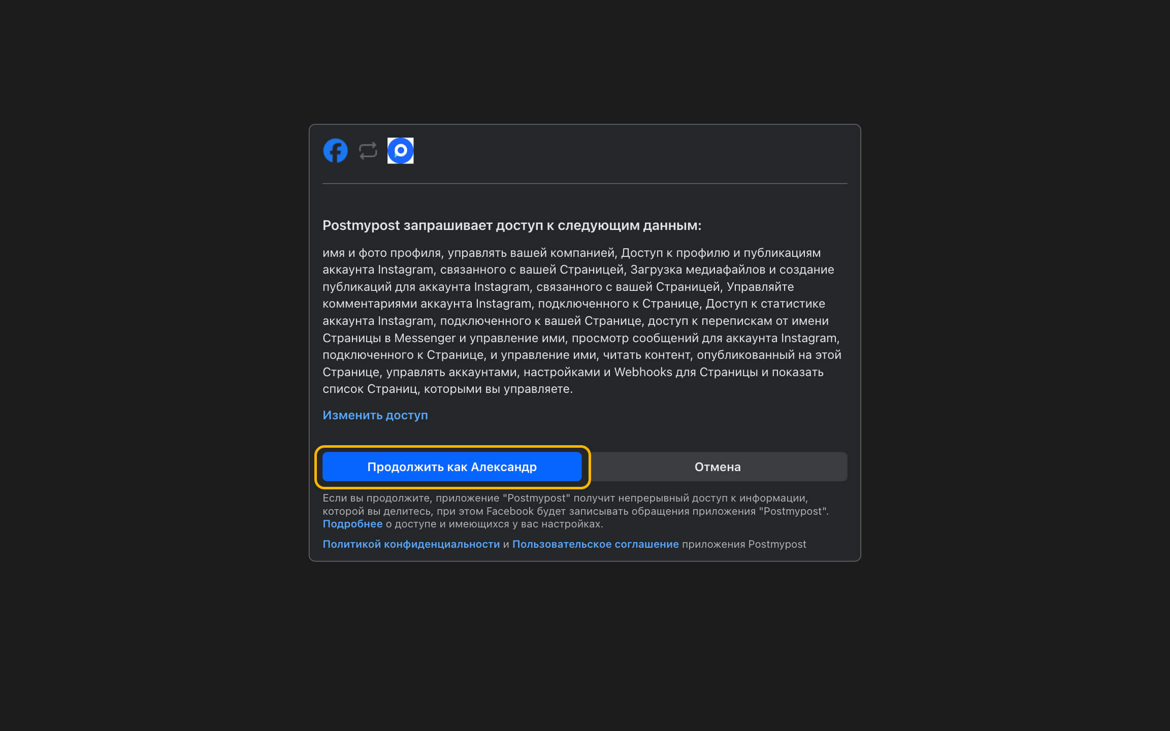 - Instagram-ды Postmypost-қа ресми қосу терезесі ашылады, онда Postmypost жұмысына қажетті нақты деректер мен құқықтар көрсетіледі. Қолжетімдіктің ұсынылуына келісетініңізді тексеріп, «Жалғастыру» батырмасын басыңыз.