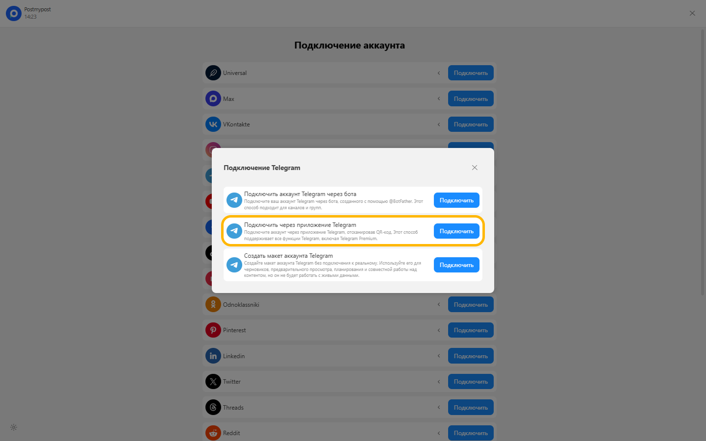 https://t.me/channelname. - Postmypost-та «Аккаунттар» бөліміне өтіп, «Қосу» батырмасын басыңыз. Әлеуметтік желілер тізімінен Telegram-ды және «Telegram қосымшасы арқылы қосу» қосылу түрін таңдаңыз.