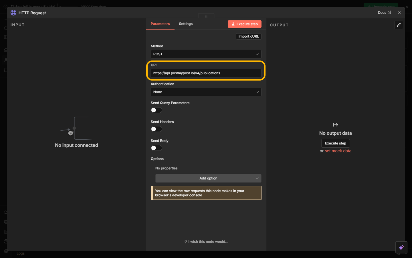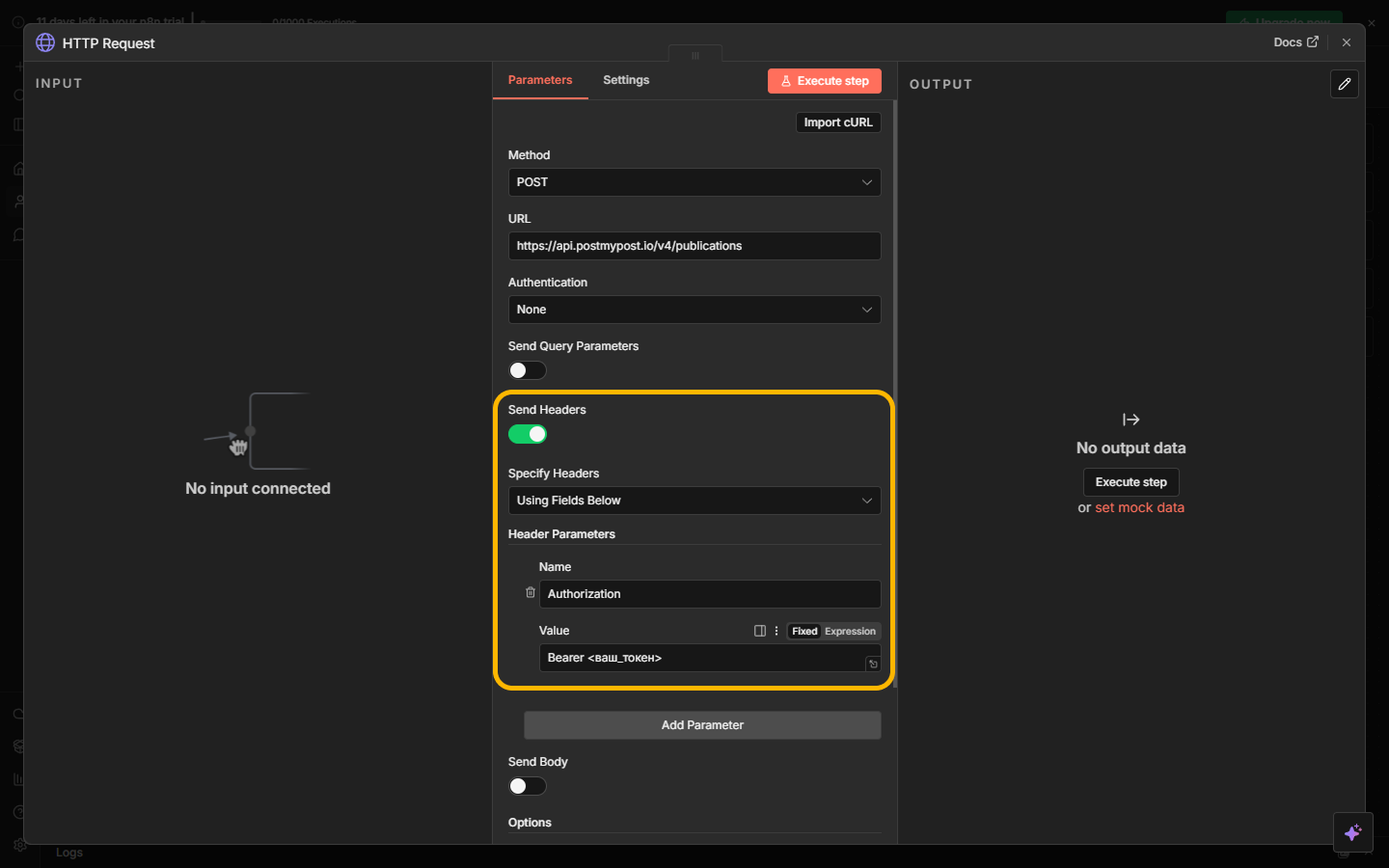 - URL енгізіңіз: https://api.postmypost.io/v4/publications