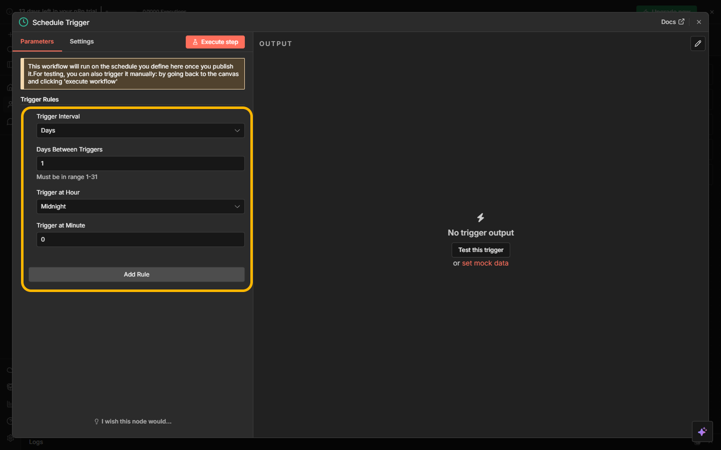 - Schedule Trigger (Триггер по расписанию) қосыңыз.