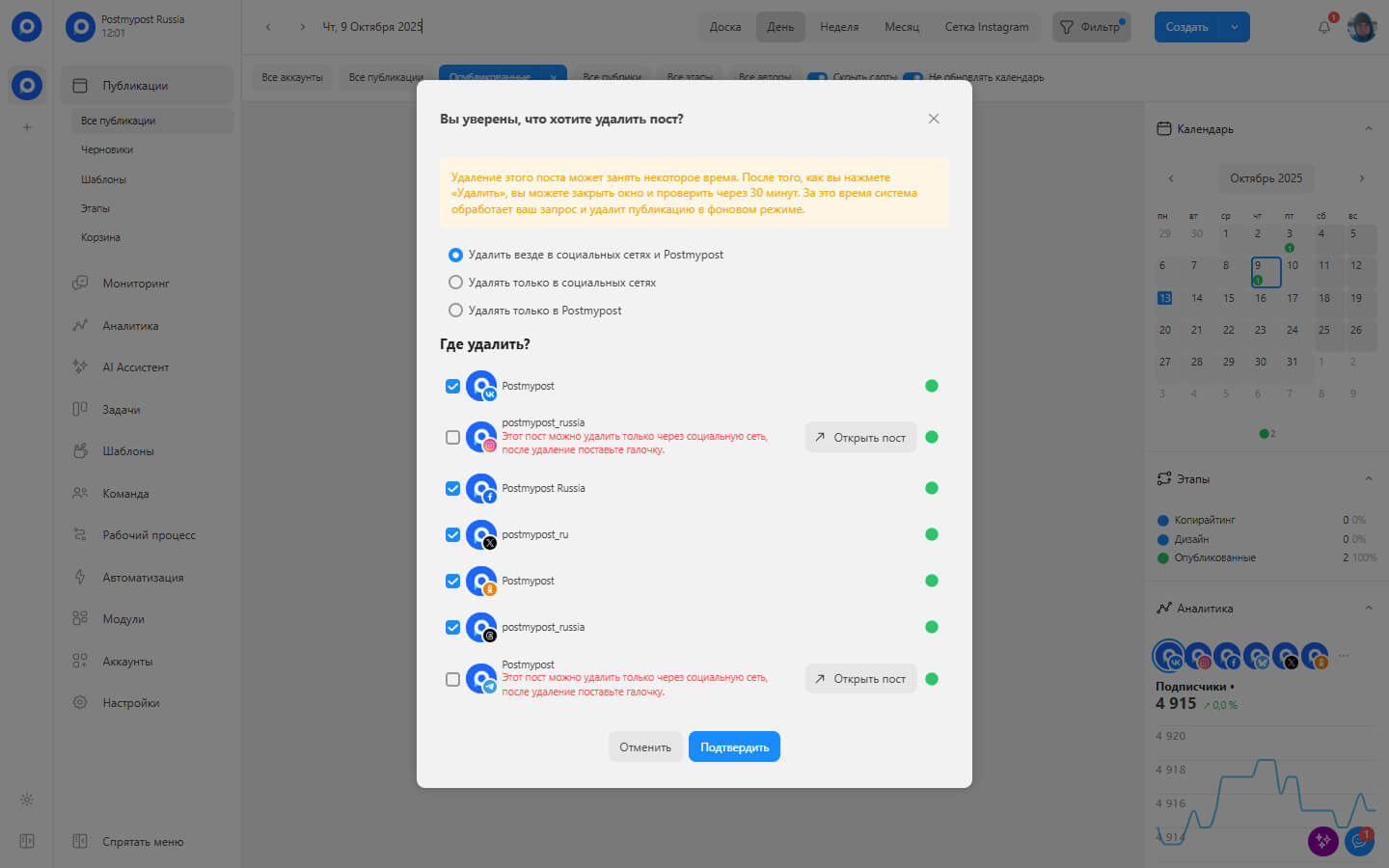 - Тек әлеуметтік желілерден жою (пост Postmypost-тен қалады)
