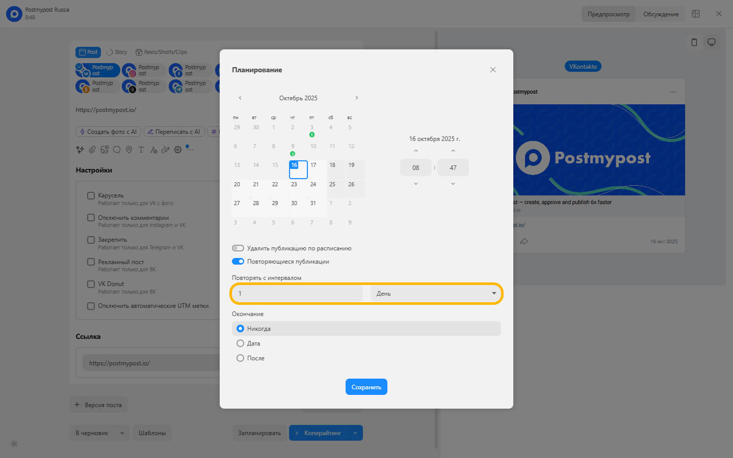 Қайталап жариялау берілген кесте бойынша контентті автоматты түрде жариялауға мүмкіндік береді, әр постты бөлек жасау қажеттілігінсіз.