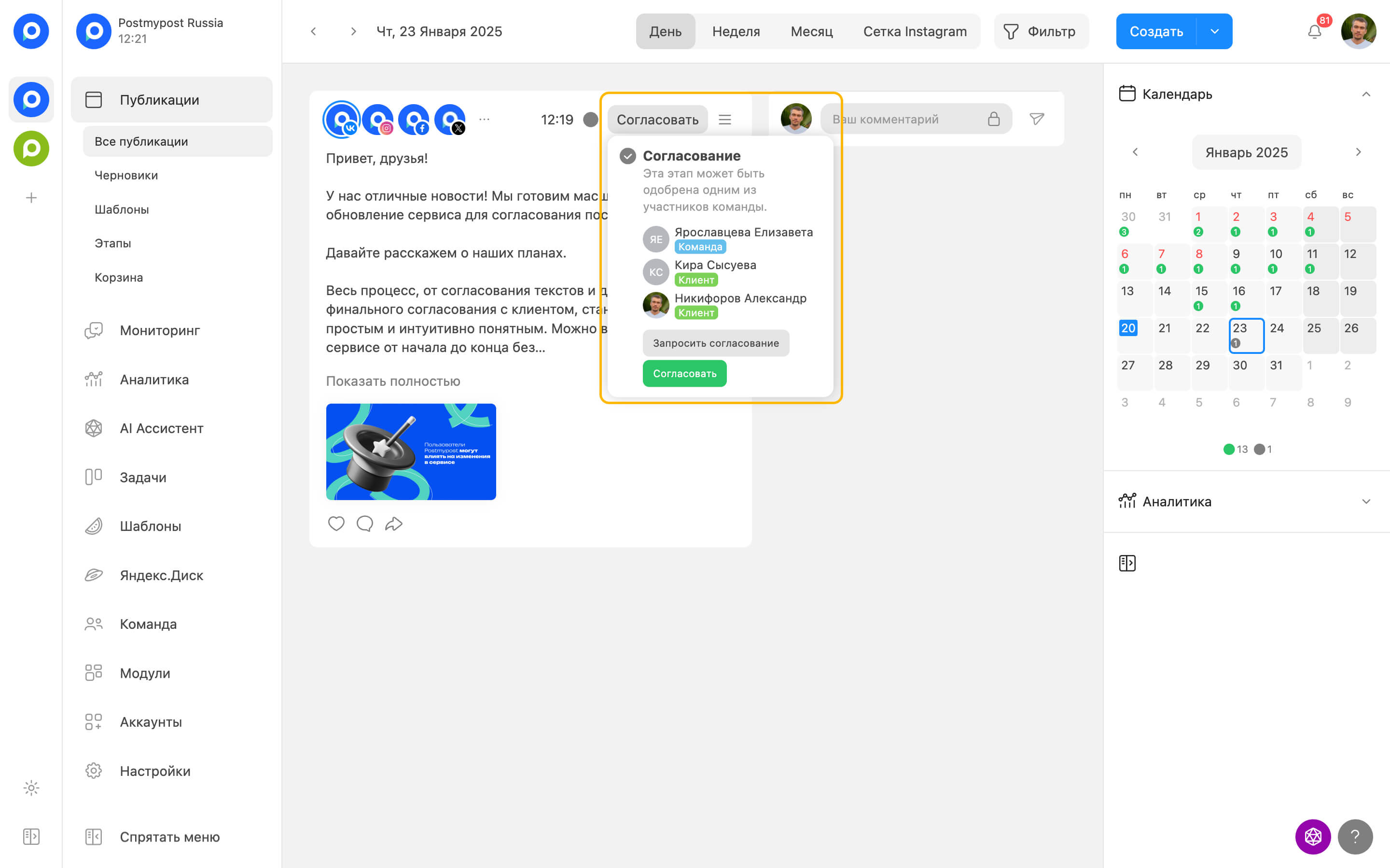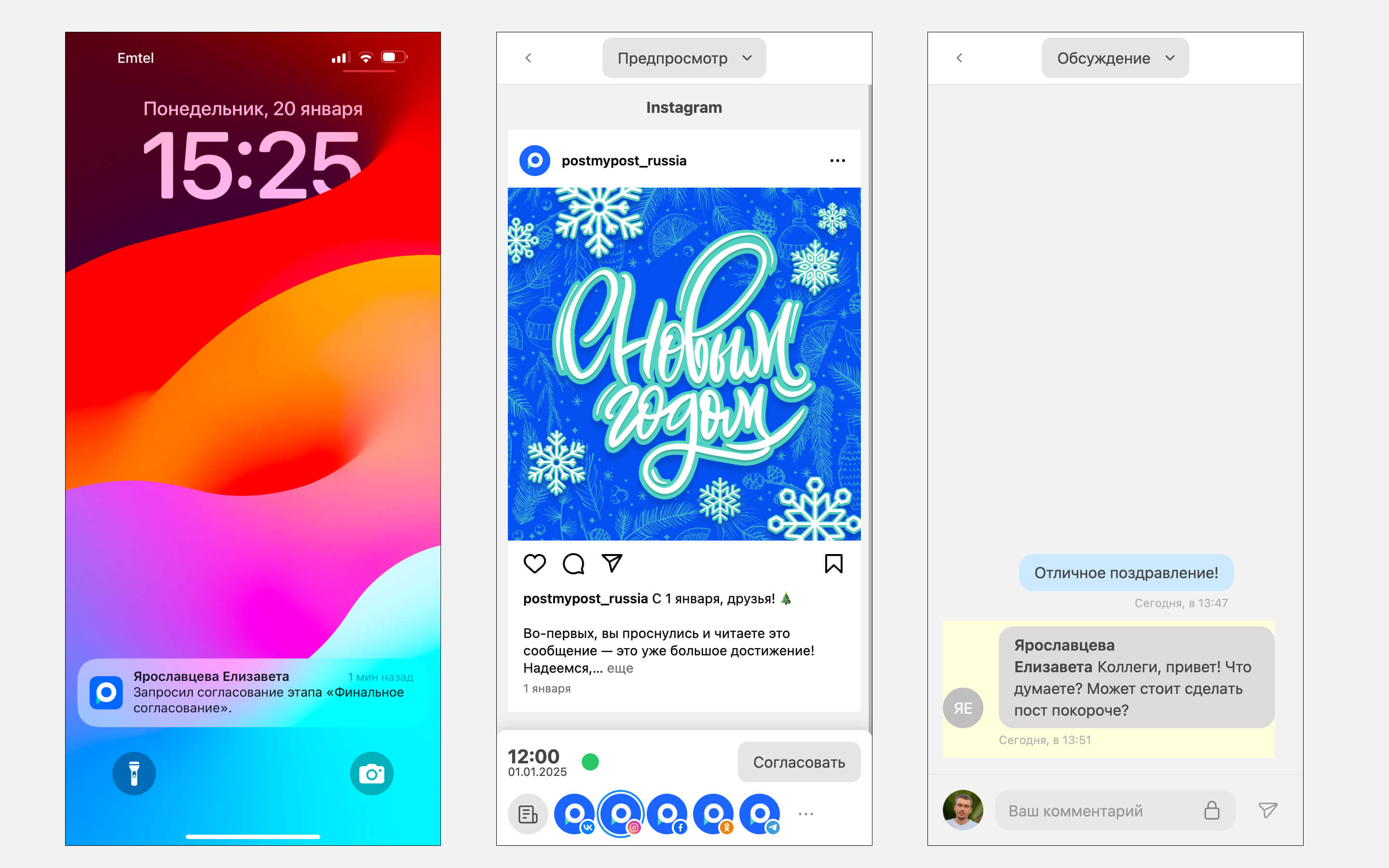 Келісім кезінде Postmypostтағы посттар әлеуметтік желілерде қалай көрінетінін мүмкіндігінше жақын түрде көрсетіледі. Бұл мәтіндегі, визуалды ресімдеудегі және форматтаудағы мүмкін болатын қателерді алдын ала анықтауға көмектеседі, бұл келісім процесін оңайлатып, оны ыңғайлы және мөлдір етеді.