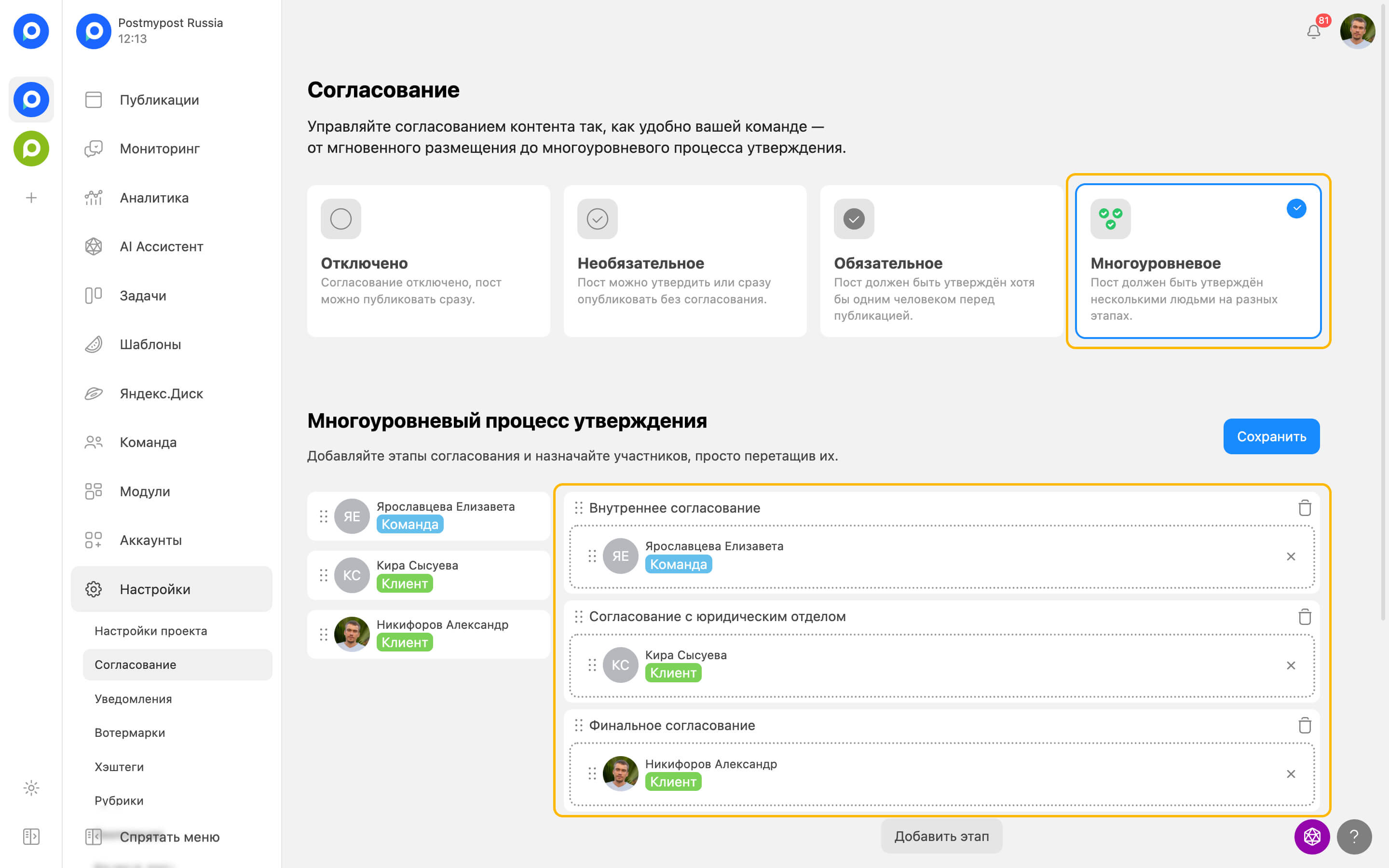 Сіз контентпен жұмыс істеу кезеңдерін құра аласыз және олардың арасына посттарды жылжыта аласыз, осылайша олардың мәртебесін нақты қадағалай аласыз. Келісім кезеңдерін қосу — бәрі сіздің міндеттеріңізге байланысты. Икемді орнату сіздің командаңызға ыңғайлы етіп процесті құруға және мазмұнды құру мен бекіту процесін тиімді басқаруға мүмкіндік береді.
