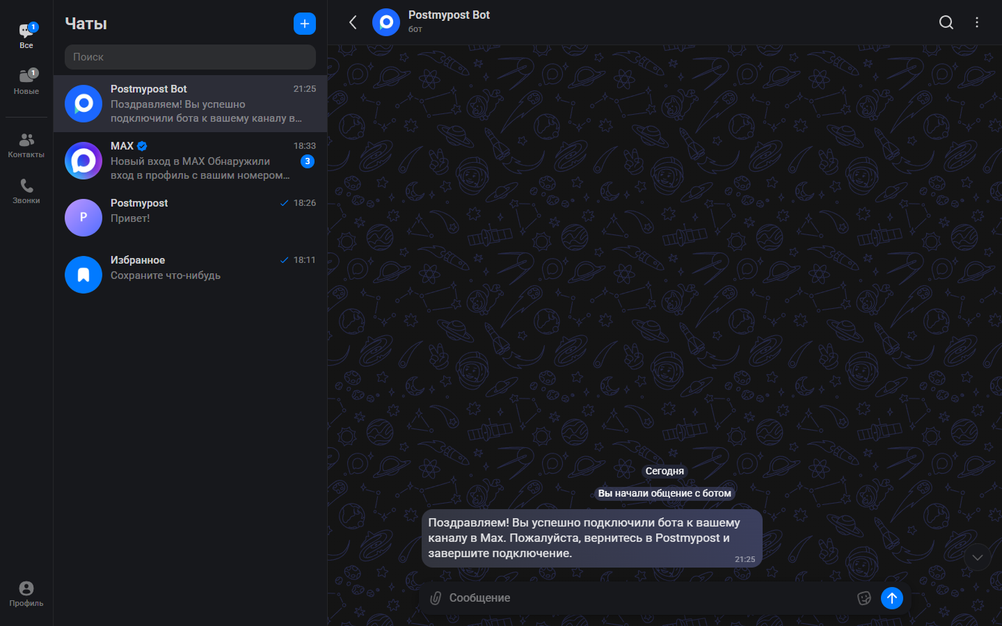 Следуйте этим шагам, чтобы подключить ваш канал в MAX через бота Postmypost.