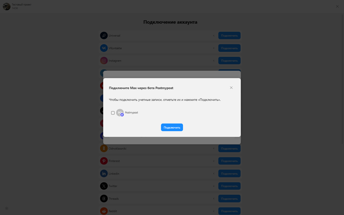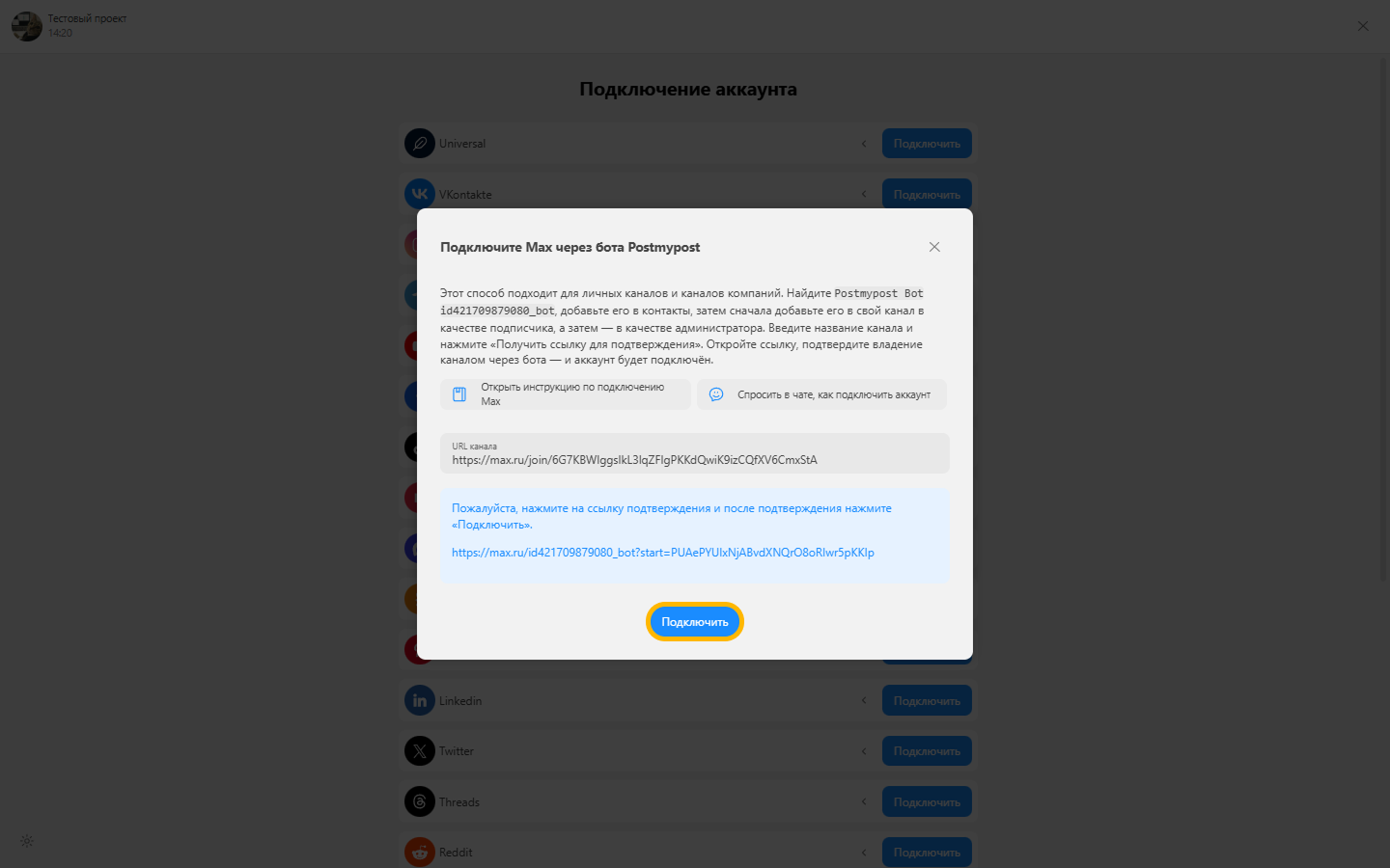 - После ответа бота вернитесь в Postmypost и нажмите подключить.