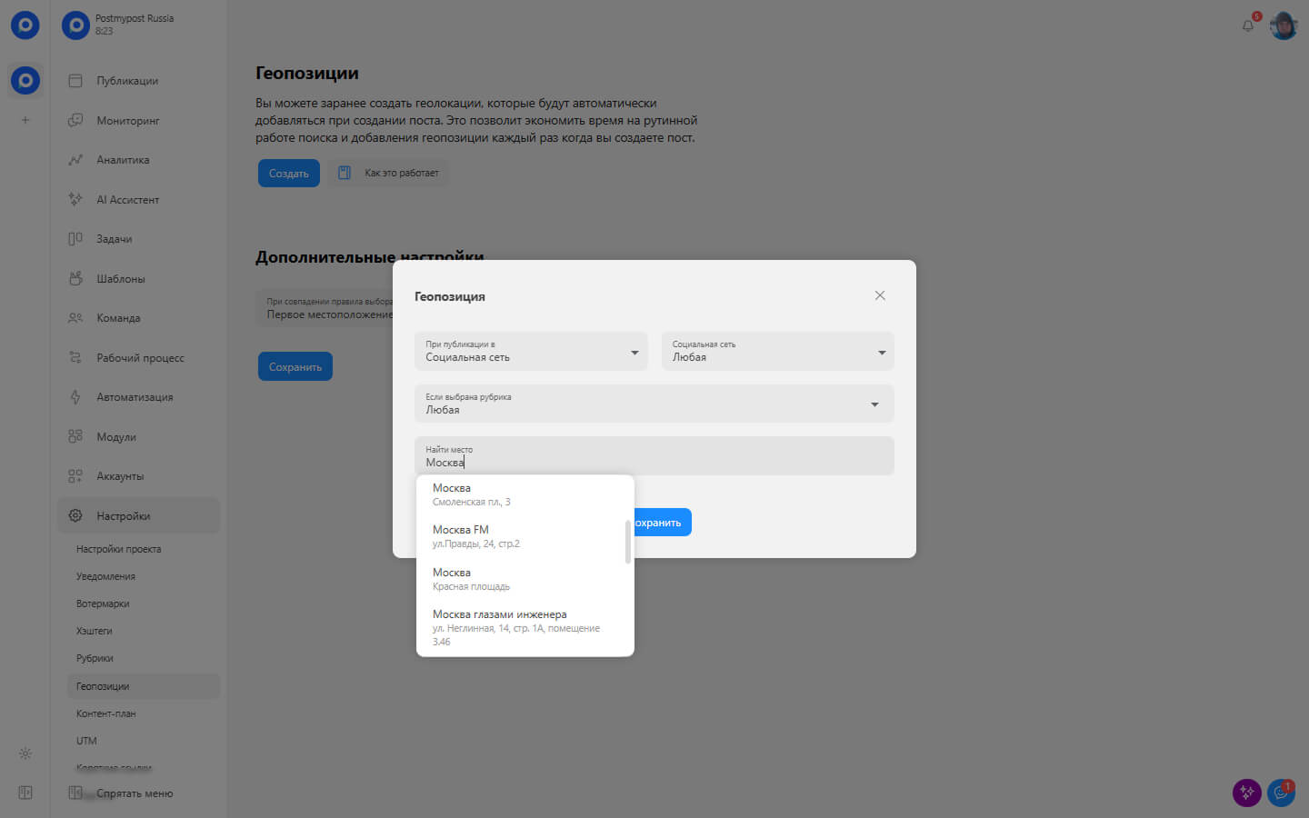 Автоматизация геопозиции в Postmypost позволяет автоматически добавлять местоположение к постам, избавляя от необходимости вручную указывать его каждый раз. Вы можете настроить правила подстановки геопозиции для каждой социальной сети или аккаунта.